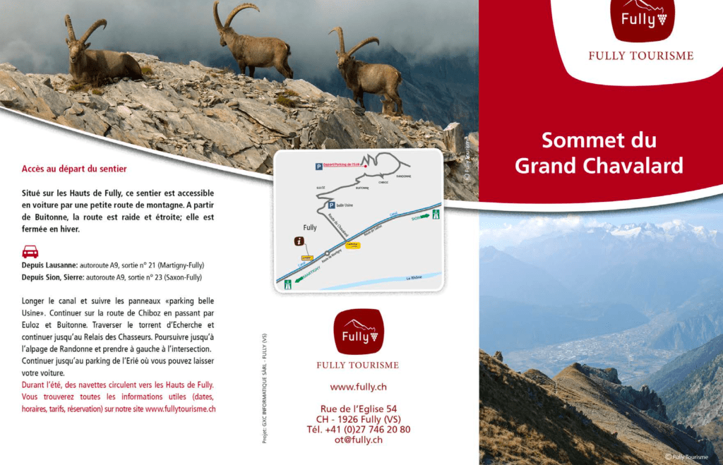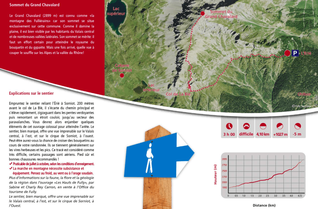 La montée « par les paravalanches » (côté SSW) est un chemin balisé bleu et blanc. La cotation est T3. Le début de ce chemin se situe sur le chemin de l’Erié, entre le parking de l’Erié et le lieu-dit « La Blè » (juste avant Sorniot). Il commence par la traversée d’un couloir un peu exposé, puis il s’agit de traverser les lignes de paravalanches en passant au travers de ceux-ci par des ouvertures étroites. Une fois sorti des paravalanches le sommet est en vue. Rejoindre l’arête et longer celle-ci légèrement sur la gauche jusqu’au sommet. Un sentier est marqué tout le long de la montée. (3h00 et +1100m depuis L’Erié) Plus d’informations sur le site de Fully Tourisme.