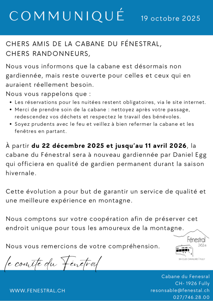 - NOUVEAU: les réservations se font uniquement en ligne via ce lien. Les disponibilités en lits de la cabane y sont également visibles.
